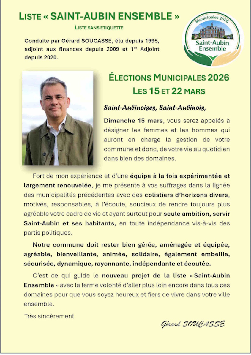 Liberté de parole, Indépendance d'esprit, Solidarité, ce sont les maîtres-mots qui unissent toute votre nouvelle équipe "Saint Aubin Ensemble".