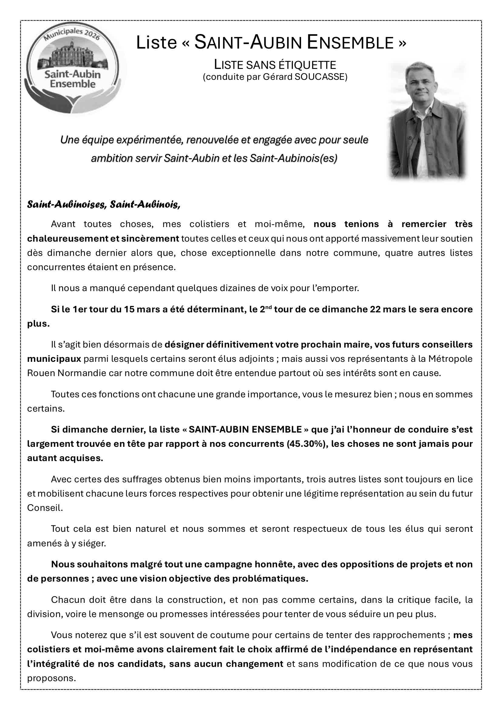 Courrier de Gérard SOUCASSE aux Saint Aubinois(es) pour le  22/03/2026
